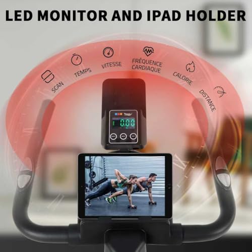【ÉCRAN LCD & SUPPORT POUR TABLETTE】: Vélo appartement ayant Écran LCD qui affiche Temps /Vitesse /Calories /Distance /Pulsations. Pleinement savoir vos diverses données sportives et développer un entraînement cycliste personnalisé qui vous convient. Surveillance de la fréquence cardiaque pour un exercice sûr et sain. Support pour tablette/téléphone portable,il est possible d’écouter de la musique et la radio, ou de regardé la télévision au cours de votre fitness. Augmenter l’intérêt de la forme physique