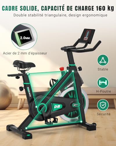 Vélo d’Appartement, DMASUN Vélo d’Intérieur Ultra Silencieux, Résistance à Ajustement Continu, Cardio à Domicile, Guidon et Siège Réglables, Porte-bouteille d’eau, Capacité de Charge 160 kg