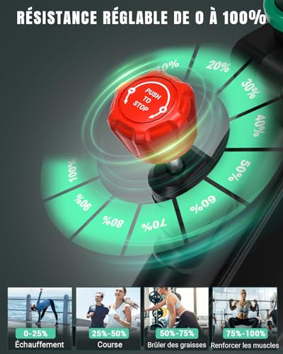 【RÉGLAGE CONTINU DE LA RÉSISTANCE – DE 0 % À 100 %】Le système de freinage classique permet un ajustement précis et progressif de la résistance. Que vous soyez en phase d’échauffement léger (0-20 %), en train de brûler des graisses (50-80 %) ou de renforcer vos muscles (80-95 %), ce vélo d’appartement vous permet de personnaliser votre entraînement en fonction de vos objectifs et de verrouiller la résistance en toute sécurité.