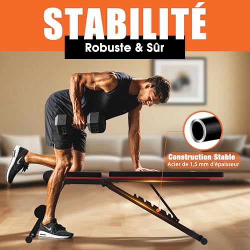 【AJUSTEMENT PERSONNALISÉ】 Dossier réglable sur 8 positions pour un confort optimal. Transformez votre banc musculation multifonction en banc plat ou incliné – parfait pour le développé couché, les sit-ups et l’entraînement des abdominaux.
