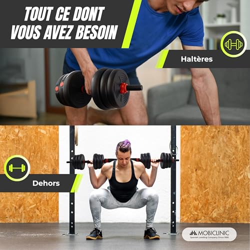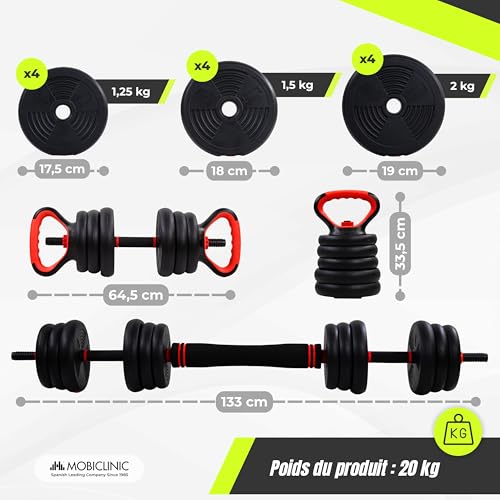 Mobiclinic®, Haltères Réglables 20 kg, 4 en 1, Ensemble de Poids, Haltères, Kettlebells et Support de Pompes, Barre de Connexion, Poignée Antidérapante, Mobimax, Gym à Domicile, Fitness