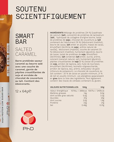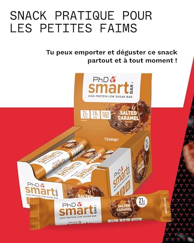PhD Nutrition Smart Bar Barre protéinée 12x64g Caramel salé – En-cas High Protein avec 21g de protéines et peu de sucre, Barre protéinée macro-friendly