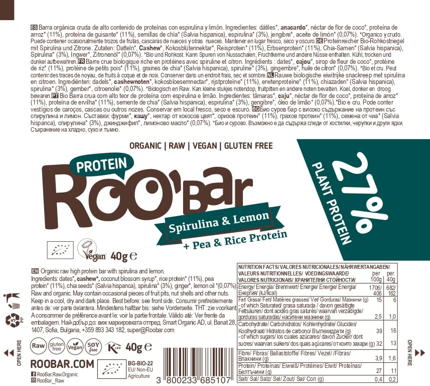Roo’bar Barre Protéinée Spiruline & Citron – Bio & Vegan – 40g (Lot de 2)