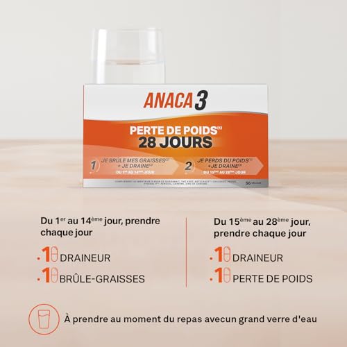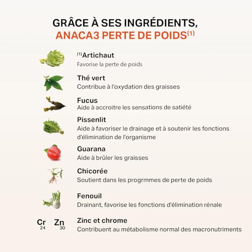 COMPLEMENT ALIMENTAIRE ANACA3 PERTE DE POIDS(1) 28 jours : Anaca3 Perte de Poids(1) 28 jours est un complément alimentaire 3 en 1 élaboré à partir de plantes qui favorisent la perte de poids(1), aident à brûler les graisses(2) et à favoriser le drainage(3).