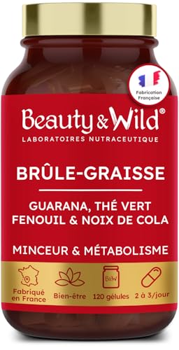 Bruleur de Graisse Puissant, Formule Minceur avec Guarana, Thé Vert, Coupe Faim Naturel, Complément Perte de Poids, Cure de 1 mois, 120 Gélules, Fabriqué en France, Laboratoires Beauty&Wild