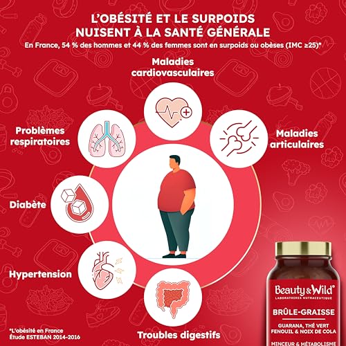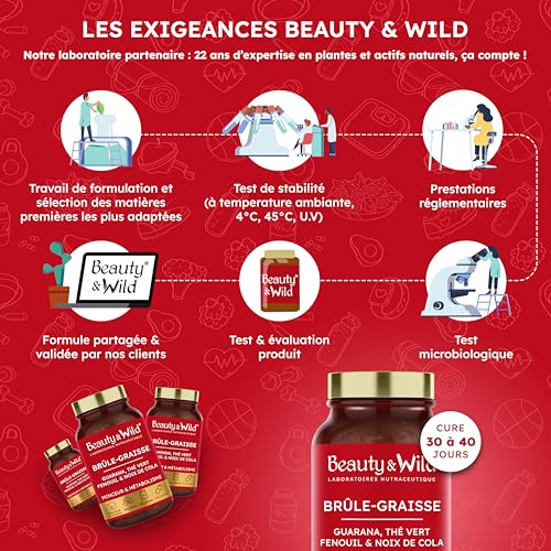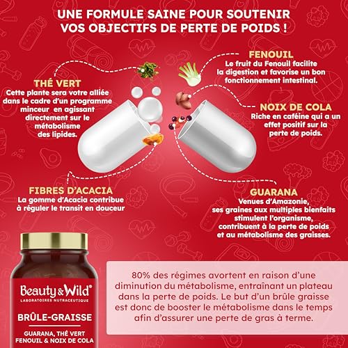Le Brûle-Graisse Naturel Beauty&Wild est un complément alimentaire minceur formulé pour accompagner efficacement les personnes souhaitant favoriser la perte de poids, stimuler le métabolisme et affiner leur silhouette, dans le cadre d’un mode de vie sain et équilibré. Sa formule experte associe des plantes reconnues pour leurs effets sur la combustion des graisses, l’énergie et la digestion : guarana, thé vert, noix de cola, fenouil et fibres d’acacia. Cette synergie d’actifs naturels soutient la thermogenèse, aide à la mobilisation des graisses de réserve, et accompagne les efforts de rééquilibrage alimentaire et d’activité physique régulière. Grâce au guarana et à la noix de cola, sources naturelles de caféine, ce brûleur de graisse contribue à maintenir un bon niveau d’énergie, de tonus et de concentration, particulièrement utile lors d’un régime minceur ou d’une phase de sèche. L’énergie est progressive et durable, sans sensation de chute brutale, pour rester actif et motivé au quotidien. Les fibres d’acacia et le fenouil apportent un réel bénéfice sur le confort digestif. Elles aident à réduire les ballonnements, à favoriser un bon transit intestinal, et à soutenir l’élimination des déchets et toxines, contribuant ainsi à une sensation de légèreté et à un ventre plus plat. Ce complément alimentaire minceur ne se substitue ni à une alimentation équilibrée ni à une activité physique. Il agit comme un soutien naturel, sérieux et responsable, sans promesse irréaliste. Pour des résultats visibles et durables, une cure de 3 mois est recommandée afin de stabiliser le métabolisme, optimiser la perte de graisses et limiter l’effet yo-yo. Le Brûle-Graisse Naturel Beauty&Wild est 100 % végan, sans OGM, sans gluten, sans lactose et sans additifs inutiles. Il convient aussi bien aux femmes qu’aux hommes, quels que soient leurs objectifs minceur : perte de poids, affinement de la silhouette, remise en forme ou accompagnement sportif. Fabriqué en France, dans un laboratoire certifié, ce complément alimentaire répond à des normes de qualité strictes et s’inscrit dans une démarche de transparence, de sécurité et d’efficacité. Beauty&Wild met son expertise en nutraceutique au service de solutions naturelles, pensées pour prendre soin du corps sur le long terme.