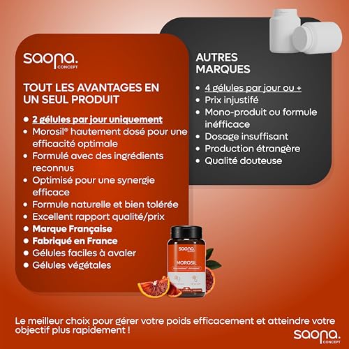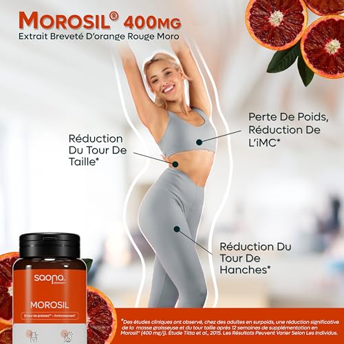 🍊 MOROSIL : ACTIF MINCEUR BREVETÉ – Morosil est un extrait breveté de l’orange rouge Moro, riche en anthocyanes, cliniquement étudié pour son potentiel à réduire l’accumulation de graisses abdominales. Avec 400 mg de Morosil, cet ingrédient extra fort cible efficacement le ventre plat, pour une action minceur visible.