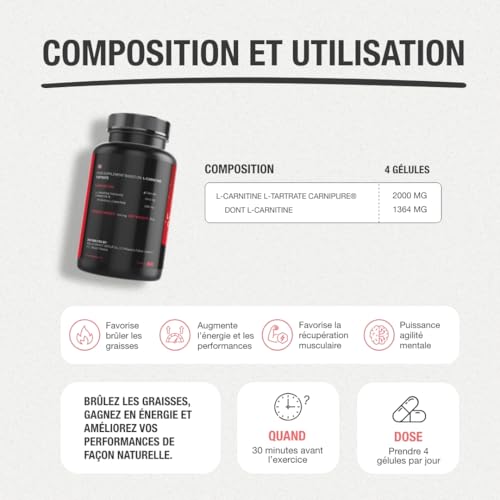L-Carnitine L-Tartrate Carnipure ®,Capsule (Agent d’enrobage (Hydroxypropylméthylcellu-lose), Eau purifiée, Gélifiant (Gomme gellane)), Farine de riz,Agent de charge (Carbonate de magnésium),Antiagglomérant (Sels de magnésium d’acides gras).COMPLÉMENT ALIMENTAIRE À BASEDEL-CARNITINE