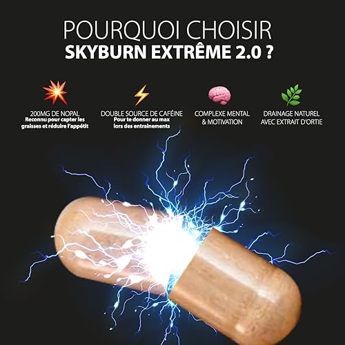 ⚡ BRÛLEUR DE GRAISSE ULTRA PUISSANT POUR UNE PERTE DE POIDS RAPIDE & EFFICACE – SKYBURN Extrême associe le Guarana, la Rhodiola et la caféine pour stimuler la thermogenèse, booster le métabolisme et favoriser une combustion des graisses rapide et efficace. Idéal pour les personnes cherchant un brûleur de graisse puissant pour un ventre plat, une silhouette affinée et une détox complète.