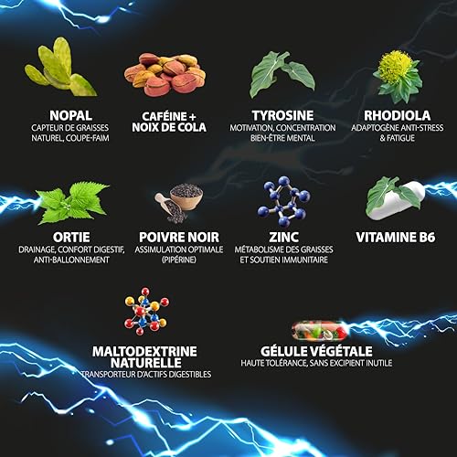 🔥 ACCÉLÈRE LE MÉTABOLISME, BOOSTE L’ÉNERGIE & OPTIMISE LA SÉCHÉ – Sa formule enrichie en caféine anhydre, Rhodiola rosea, Guarana et Vitamine B6 active la combustion des graisses, améliore l’oxydation des lipides et augmente la dépense énergétique. Idéal pour les sportifs, les personnes actives et celles cherchant à maintenir une énergie durable tout au long de la journée. Une solution puissante pour optimiser la sèche musculaire et préserver la masse maigre.