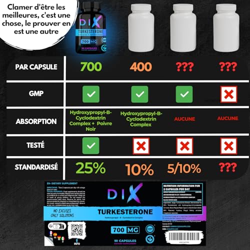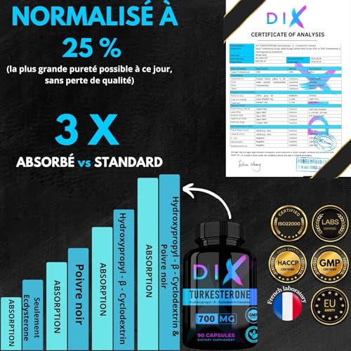🥇POURQUOI CHOISIR DIX TURKESTERONE ? 🥇 Comme pour tous nos produits, nous sélectionnons des matières premières de qualité irréprochable. Notre Turkesterone se distingue par sa qualité supérieure, obtenue grâce à une extraction et une filtration de pointe. En tant que pionniers dans le domaine, nous sommes fiers de vous offrir un taux standardisé de 25 %, tout en préservant une qualité optimale de ses composants actifs.