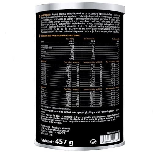 Sirop de glucose, isolat de protéines de lactosérum (LAIT), (emulsifiant: lécithine de tournesol et/ou SOJA) dextrose, maltodextrines, arome orange, anti-angglomerant: phosphate tricalcique, minéraux : carbonate de potassium, carbonate de magnésium, L-glutamine, sel, acidifiant: acide citrique, colorant: betacarotene (maltodextrine, acacia, saccharose, antioxydants : dl-alpha-tocophérol -ascorbate de sodium), vitamine C, gluconate de zinc, bicarbonate de sodium, gluconate de manganese, vitamine E, vitamine B3, Extramel®(jus de melon lyophilise, huile végétale), vitamine B5, vitamine A (maltodextrine, acacia, antioxydant: dl -alpha-tocopherol), vitamine B12, gluconate de cuivre, vitamine B6, vitamine B2, vitamine B1, vitamine B9, sélenite de sodium. vitamine B8.