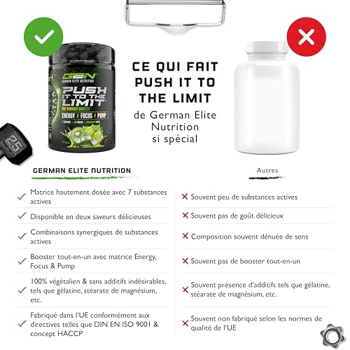 POURQUOI PUSH IT FOR THE LIMIT : la plupart des pré-entraînements sur le marché sont soit trop faiblement dosés, soit basés sur des formulations sans fondement scientifique solide. De plus, de nombreux boosters sont fabriqués dans des usines peu coûteuses situées dans des pays de l’UE, ce qui implique souvent une baisse de la qualité. Push It For The Limit est synonyme d’une formule bien pensée et fortement dosée, qui répond aux normes de qualité les plus élevées et qui a été spécialement conçue pour fournir une performance maximale.