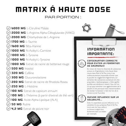 COMPOSITION HAUTEMENT DOSÉE : la recette soigneusement sélectionnée de notre pré-entraînement hautement dosé en détail : L-citrulline, AAKG, L-arginine HCL, L-taurine, bêta-alanine, L-carnitine, N-acétyl-L-tyrosine, L-tyrosine, extrait de racine de betterave rouge, inositol, caféine, glucuronolactone, extrait de racine de Rhodiola rosea, L-histidine, L-théanine, capsicum, acide alpha-lipoïque, rutine et extrait de poivre noir. Chaque ingrédient a été sélectionné de manière ciblée afin d’offrir un soutien optimal pour ton entraînement.