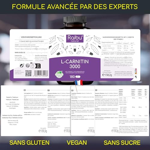 L-Carnitine 3000 I 180 Haute Dose Extra Fort Gélules avec Vitamine C I 3000mg par dose journalière I Tartrate de L Carnitine pure I Naturelle, Testé en laboratoire & Végan