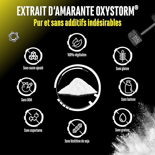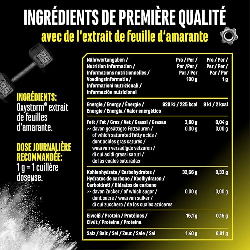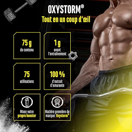 100% OXYSTORM : OxyStorm est un extrait de feuille d’amarante innovant, également connu sous le nom d’épinard rouge, et fournit une concentration particulièrement élevée de nitrate. Cette source purement végétale et végétalienne convainc par sa composition unique et est donc souvent utilisée dans les boosters pré-workout. Avec 75 portions par boîte, le produit est idéal pour compléter à long terme une alimentation équilibrée.