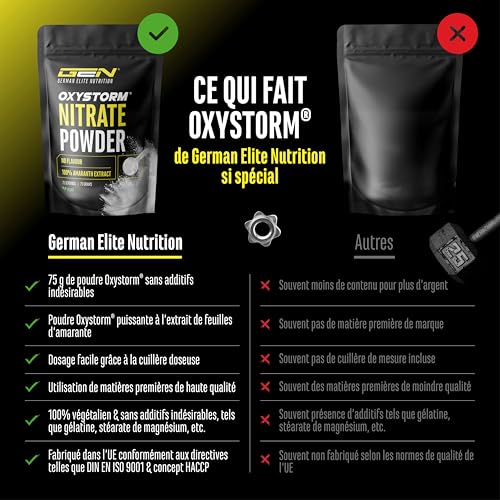 HAUTEMENT CONCENTRÉ : OxyStorm convainc par sa teneur standardisée en nitrate de 9 % (9000 mg/100 g) et compte parmi les sources naturelles de nitrate les plus puissantes au monde. Il fournit jusqu’à 5 fois plus de nitrates que la poudre de betterave rouge et même 50 fois plus que le jus de betterave rouge, pour une efficacité maximale avec une quantité minimale. Ce produit pur et végétalien est exempt d’additifs artificiels, de sucre, de gluten et d’ingrédients d’origine animale.