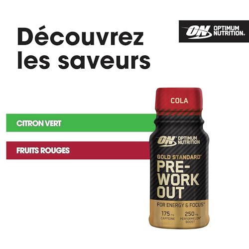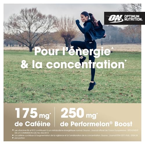 Préparez votre corps et votre esprit avant l’entraînement et libérez Gold Standard pour atteindre vos objectifs de fitness. L’Energy Shot Gold Standard Pre-Workout d’Optimum Nutrition, la marque n°1 mondiale de nutrition sportive**, vous aidera à améliorer votre concentration*. ON Gold Standard Pre-Workout est un shot unique qui contient 175 mg de caféine provenant de sources naturelles par portion, aiguisant votre vigilance et votre concentration*** et vous aidant à vous entraîner mieux, plus dur et plus longtemps. Chaque portion de cette boisson énergétique contient également 250 mg de PerforMelon Boost, une source concentrée de composés phytochimiques naturellement présents dans la pastèque. Le supplément de gym ON pré-entraînement est également enrichi en extrait de feuille de sauge et de racine d’ortie, ainsi que des vitamines B6 et B12, et aide à réduire la fatigue et à vous préparer à un entraînement encore plus intense. * En outre, ce shot d’énergie pré-entraînement* de ON fournit 1,5 g de bêta-alanine (l’un des acides aminés non essentiels) et 2 g de L-citrulline (l’un des acides aminés conditionnellement essentiels) dans chaque flacon. La boisson sportive Gold Standard Pre-Workout Energy Shot est disponible en deux saveurs savoureuses : mélange de baies et de citron vert citron. Profitez-en à tout moment, n’importe où : à la maison, à la salle de sport, ou avant toute session de terrain ou de piste. Un paquet contient 12 shots de 60 ml. Prenez-le 45 minutes avant l’entraînement. Consommation recommandée : 1 dose par jour. Les vitamines B6 et B16 contribuent à un métabolisme énergétique normal et à la réduction de la fatigue et de la fatigue. Source : RÈGLEMENT (UE) No 432/2012 DE LA COMMISSION du 16 mai 2012. **Source : Euromonitor International Limited ; Consumer Health 2023 Edition, catégorie de poudre de protéines sportives, % de part de valeur du détaillant, données 2022 ***Source : EFSA Journal 2011; 9(4) : 2054 24