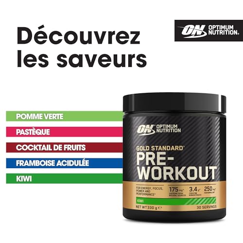 Optimum Nutrition Gold Standard Pre Workout en poudre, boisson énergétique avec créatine monohydrate, bêta-alanine, caféine et vitamines B, complément goût Kiwi, 30 portions, 330 g