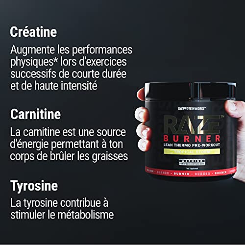 Qu’est-ce que Raze Burner Pre Workout ? Raze-Burner Pre Workout de THE PROTEIN WORKS fournit une énergie explosive et une concentration pour les moments où tu en as le plus besoin. Convient aux végétaliens et conçu spécifiquement pour atteindre tes objectifs physique. Raze Burner contient une foule d’ingrédients thermogéniques entièrement divulgués et soutenus par la recherche tels que la caféine, la L-citrulline, la L-tyrosine et la L-carnitine.