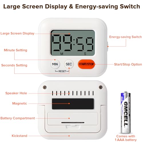 Design Économe en Énergie & Batterie Gratuite: Pour prolonger la durée de vie de la batterie et économiser de l’énergie, le minuteur de cuisine est équipé d’un interrupteur. Une pile AAA est incluse avec le minuteur cuisine, ce qui permet une utilisation immédiate dès la livraison.