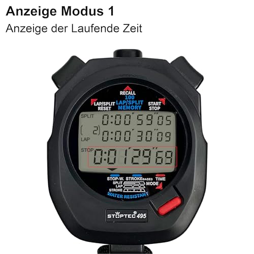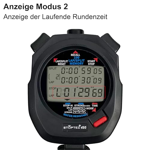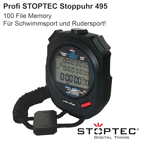 Stoptec Chronomètre 495 | Écran 3 Lignes | 100 mémoires | Mesure de la fréquence de Coups | Contrôle de la Course | Heure et Date | Résistant aux éclaboussures | Changement de Pile Facile