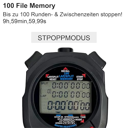 Le chronomètre Stoptec 496 est un chronomètre à mémoire de 100 files avec un grand écran à trois lignes. Les temps d’arrêt restent enregistrés jusqu’à l’effacement ciblé dans la montre. Ainsi, vous ne perdrez plus de temps. La montre dispose d’un mode horloge avec la date, une fonction de contrôle de la course et la possibilité de mesurer la vitesse de frappe en parallèle à l’heure actuelle sur un écran. Il est très intéressant de voir en permanence l’heure en cours (mode 1), l’heure actuelle (mode 2) ou le temps en cours en même temps avec les mesures de cadence. La montre est équipée d’un mécanisme de point de pression de qualité supérieure qui empêche les erreurs de mesure mécanique. Astuce pratique : montre très intéressante pour les entraîneurs qui souhaitent toujours avoir un œil sur la durée de rotation et le temps total en cours (mode 1/2/3). Il est possible de changer facilement le mode. L’arrêt parallèle du temps et de la mesure des fréquences de frappe est possible avec cette montre. La fonction de contrôle de la course apportera beaucoup de plaisir à tous les entraîneurs et activités. Notre montre professionnelle pour les entraîneurs d’athlétisme, de natation et de rameur – Information : lors des compétitions de natation à la télévision affiche souvent l’heure actuelle du nageur par rapport à l’heure du record mondial. Cette fonction peut être simulée individuellement avec le Stoptec 496 pour documenter une compétition ou une course d’entraînement et pour analyser dès la course. Pour cela, la montre programmera l’heure et le nombre de pistes. Lors de la compétition ou de l’entraînement, les temps de chaque piste sont arrêtés. L’horloge affiche dans la ligne supérieure la différence de temps de tour, qui résulte de la valeur moyenne du temps cible et du nombre de pistes. Toutes les données peuvent être stockées dans la montre et analysées plus tard. Dans l’exemple ci-dessous, la fonction est affichée. Exemple de sport de natation : 100 mètres.